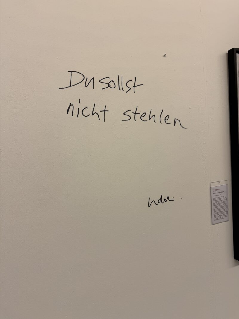 Und auf einmal verfügt die LUDWIGGALERIE über ein Lindenberg-Original: Spontan schnappte sich der Künstler bei seinem Besuch zur Eröffnung der Ausstellung einen Stift und hinterließ eine Botschaft an der Wand – die plötzlich Teil seines Zyklus zu den Zehn Geboten wurde. Die Besucherinnen und Besucher der Schau haben unterschiedliche Ideen, wie Christine Vogt mit dem Werk umgesehen soll: Von „einrahmen“, bis „einfach so lassen“, lauten die Einwürfe.