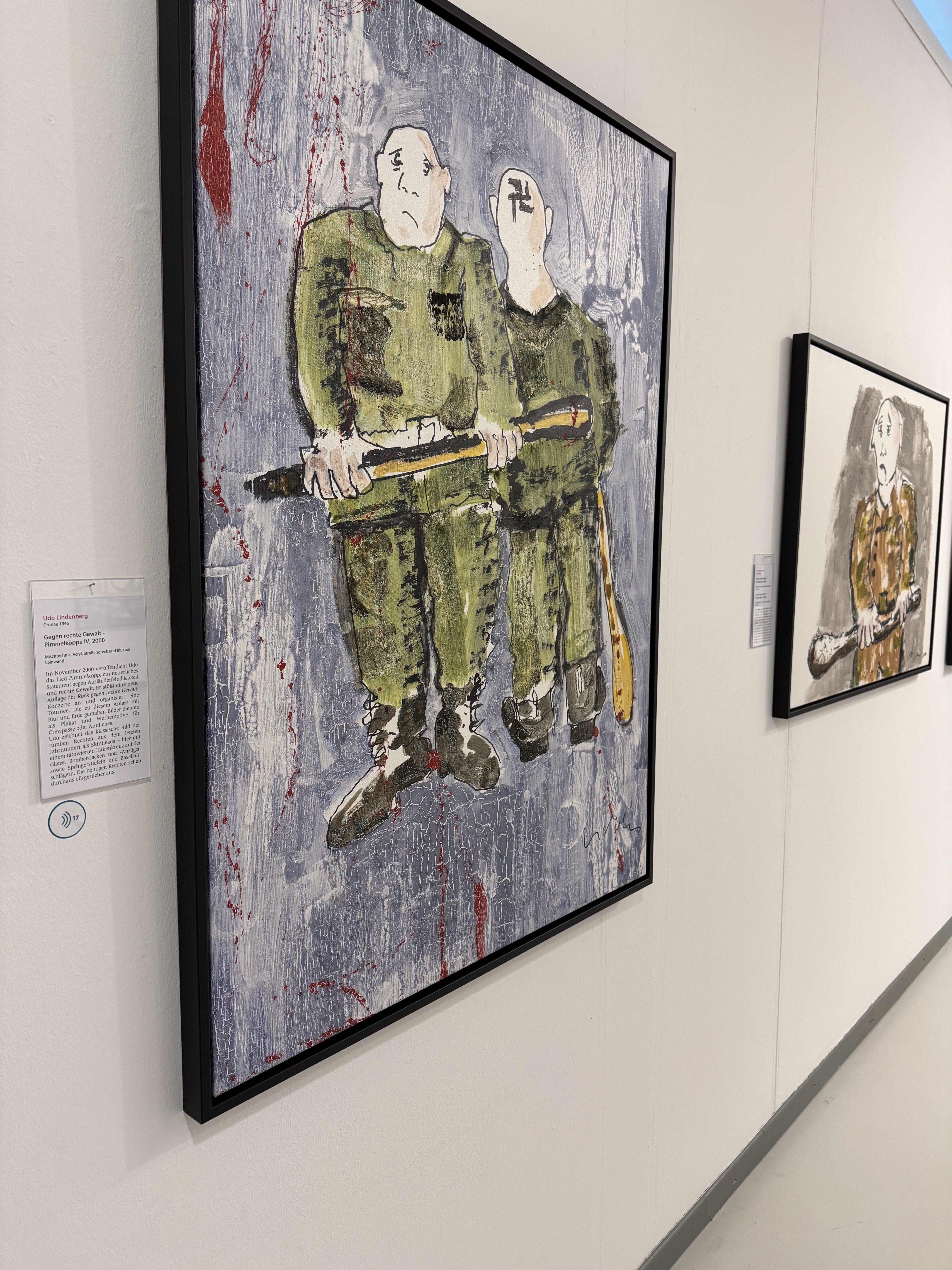 Die Ausstellung zeigt ihn von seiner nachdenklichen Seite: In Selbstporträts thematisiert er die eigene Alkoholabhängigkeit, mit aufgedunsenen Gesichtern und verzerrten Zügen. Seit über 20 Jahren lebt Lindenberg trocken – und reflektiert diese Lebenskrise in seiner Kunst. Daneben gibt es Humor, Provokation und klare politische Botschaften, etwa in der Serie „Pimmelköppe“.